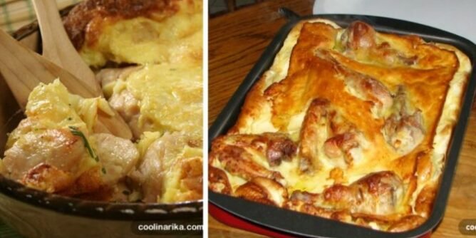U vatrostalnu posudu ili pleh stavite preostalo ulje i zagrijte ga. Na toplo ulje izlijte trećinu pripremljene smjese od jaja i brašna. Na to rasporedite popečeno meso, a po mesu izlijte preostalu smjesu od jaja, brašna i mlijeka.