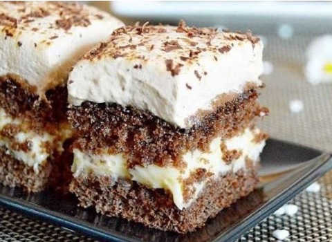 Sastojci: 2 jaja– 100 g šećera– 1 dl ulja– 2 dl mleka– 200 g brašna– prašak za pecivo– 2 kašike kakaoa Fil: 1 l mleka–…