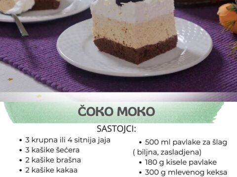 Sastojci: Kora: 3 krupna ili 4 sitnija jaja 3 kašike šećera 2 kašike brašna 2 kašike kakaa 50 ml ulja 5 g praška za pecivo…