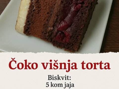 Sastojci Biskvit: 5 kom Jaja 150 g Šećer 2 pakovanja Vanilin šećer 5 kašika Mlijeko 5 kašika Ulje 100 g Oštro brašno 1 pakovanje Puding od čokolade 2 pune kašike Kakao 100 g Tamna čokolada 5 kašika Voda 1 pakovanje Prašak za pecivo 1 prstohvat So Krema od višanja:…
