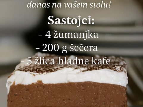 Sastojci Biskvit: – 4 zumanjka – 200 gr. secera – 5 zlica hladne kafe – 100 gr. mljevenih oraha – 5 zlica brasna – 3…