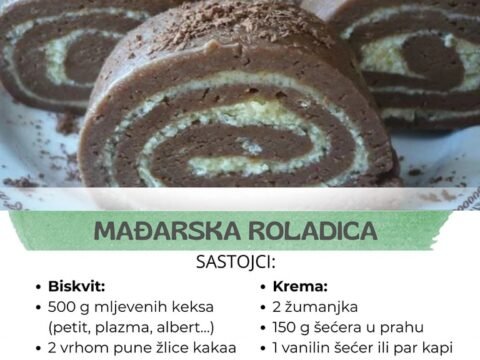 Fina, jednostavna roladica, tako mirisna i ukusna… Sastojci: Biskvit: 500 g mljevenih keksa(petit, plazma, albert…) 2 vrhom pune žlice kakaa ili čokolade u prahu 100…