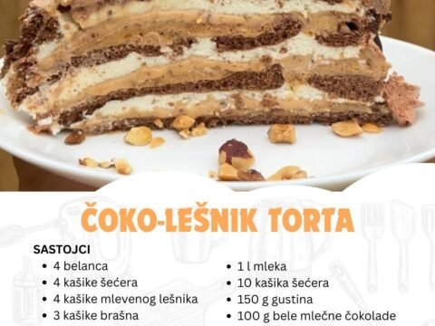 Sastojci za kore (potrebno je ispeći četiri kore, svaki put priprema ide iznova): 4 belanca 4 kašike šećera 4 kašike mlevenih lešnika 3 kašike brašna…