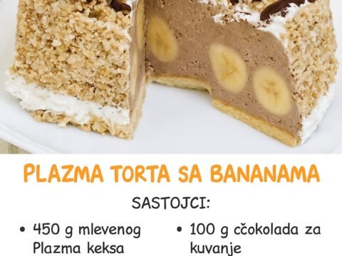 Sastojci: 450 g mlevenog keksa, 250 g mlevenih oraha, 1,5 kg banana, 4 žumanceta, 250 g šećera u prahu, 250 g putera, 100 g čokolade…