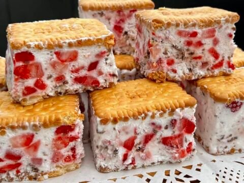 LEDENI KOLAČ ZA MINUT – sa jagodama i čokoladom: Slatkiš sav od krema! Morate da probate. Sladoled sendvič se lako pravi i to od omiljenih…