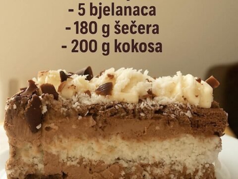 TORTA SEDMO NEBO. Bez trunke brašna, savršena… Sastojci Bijela kora: – 5 bjelanaca – 180 g šećera – 200 g kokosa Crna kora (materijal za…