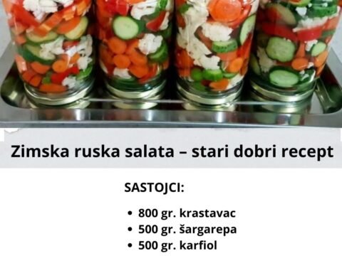 Zimska ruska salata. Stari dobri recept za najbolju salatu! Sastojci: 800 gr. krastavac 500 gr. šargarepa 500 gr. karfiol 500 gr. crvene paprike 1 kašičica…