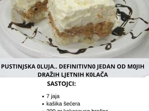 Sastojci: 7 jaja kašika šećera 200 gr kokosovog brašna 250 gr margarina 100 gr čokolade za kuhanje šlag kreme od vanilije Priprema: KORA Sedam bjelanaca…