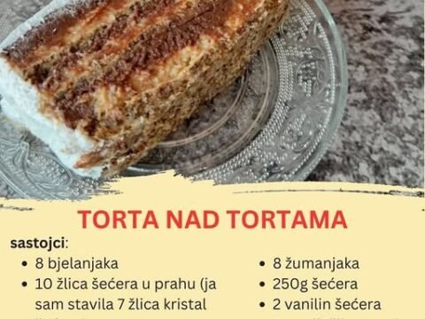 TORTA NAD TORTAMA Sastojci: Za kore: 8 bjelanjaka 10 kašika šećera u prahu (ili 7 kašika kristal šećera) 8 kašika mljevenih oraha 2…