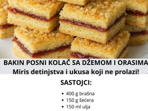 🍰 Posni kolač sa orasima i džemom Sastojci za tijesto: 400 g brašna 150 g šećera 150 ml ulja 100 ml mineralne vode 1 kesica…