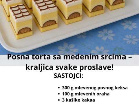 🍫 POSNA TORTA SA MEDENIM SRCIMA Sastojci za koru: 300 g mlevenog posnog keksa 100 g mlevenih oraha 3 kašike kakaa 200 ml soka od…