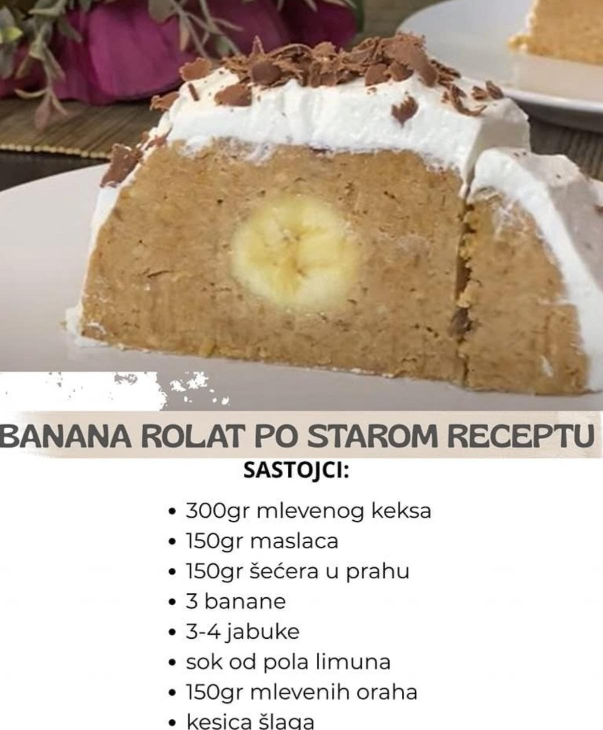 Priprema: Maslac umutite sa šećerom pa mu dodajte bananu izgnječenu. Zatim izrendajte jabuke pa ih ocedite i dodajte u smesu sa maslacom. Dodajte i sok od pola limuna, keks i mlevene orahe. Sve to jedinite u jednu smesu koju ćete oblikvati u rolat a u sredini ćete staviti bananu. Dekorišite šlagom.