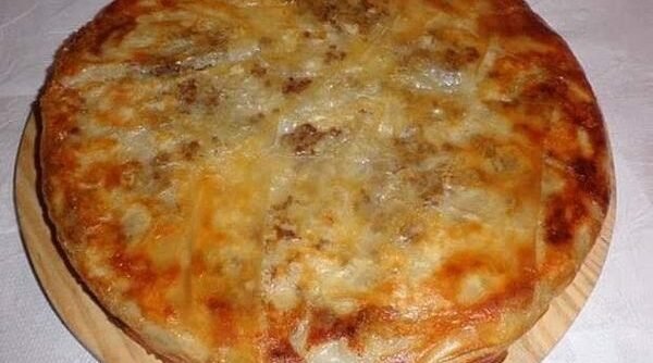 Ovako spremljen nadjev odložiti sa strane dok kore ne pripreme. Od ukupne količine kora, odvojiti 4 cijele kore. Okruglu tepsiju namazati uljem i tepsiju obložiti korama, tako da krajevi kora izlaze van tepsije.