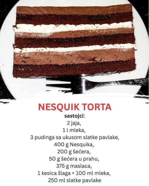 Ovo je samo opis na osnovu vidljivih sastojaka. Za detaljan recept sa preciznim uputstvima, bilo bi potrebno potražiti originalni recept za Nesquik tortu.