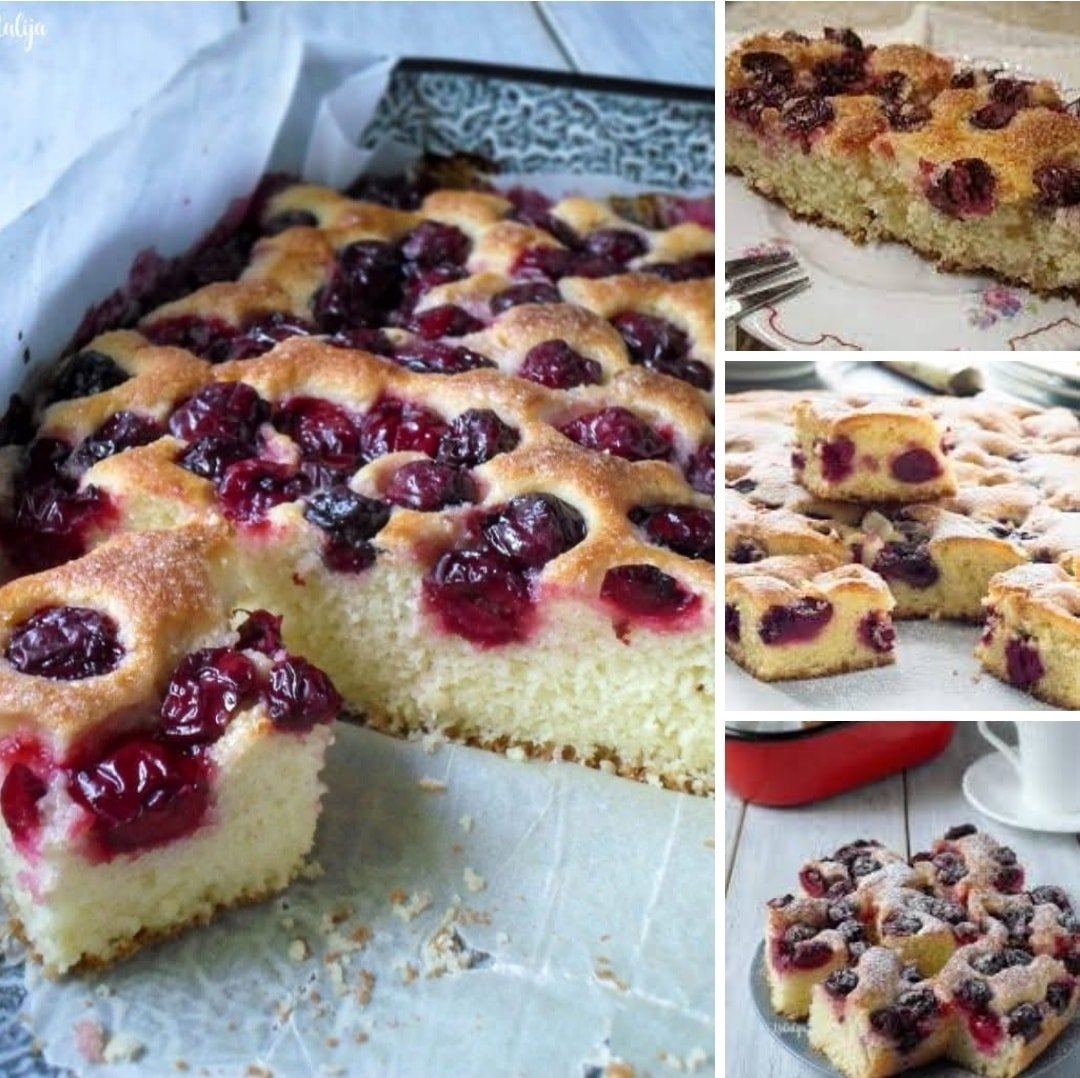 Kada se testo udvostručilo, izručite ga uz pomoć varjače u pleh, lepo poravnajte, pa nabacajte odozgo oceđene višnje. Blago ih utisnite prstima u testo. Pospite preko kristal šećerom, pa ostavite tako u plehu još nekih 10-15 minuta, da testo još malo naraste.