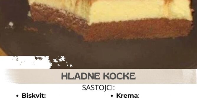 Biskvit:5 jaja,5 žlica šećera,5 žlica brašna,2 žlice kakao,1 prašak za pecivo. Zaljev (ako želite može i bez njega):1 šolja(2 dcl) šećera,1,5 šolja vode.Krema 1:2 vrećice pudinga od vanilije (dolcela),6 žlica šećera,7 dl mlijeka,20 dag margarina,1 dl tučenog slatkog vrhnja,1 vanilin šećer.Krema 2:2 vrećice šlag kreme od čokolade (dolcela)