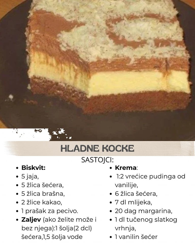 Biskvit:5 jaja,5 žlica šećera,5 žlica brašna,2 žlice kakao,1 prašak za pecivo. Zaljev (ako želite može i bez njega):1 šolja(2 dcl) šećera,1,5 šolja vode.Krema 1:2 vrećice pudinga od vanilije (dolcela),6 žlica šećera,7 dl mlijeka,20 dag margarina,1 dl tučenog slatkog vrhnja,1 vanilin šećer.Krema 2:2 vrećice šlag kreme od čokolade (dolcela)