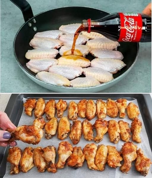 Hrskava pileća krilca s Coca-Cola umakom, čipsom od sira i umakom od sira.