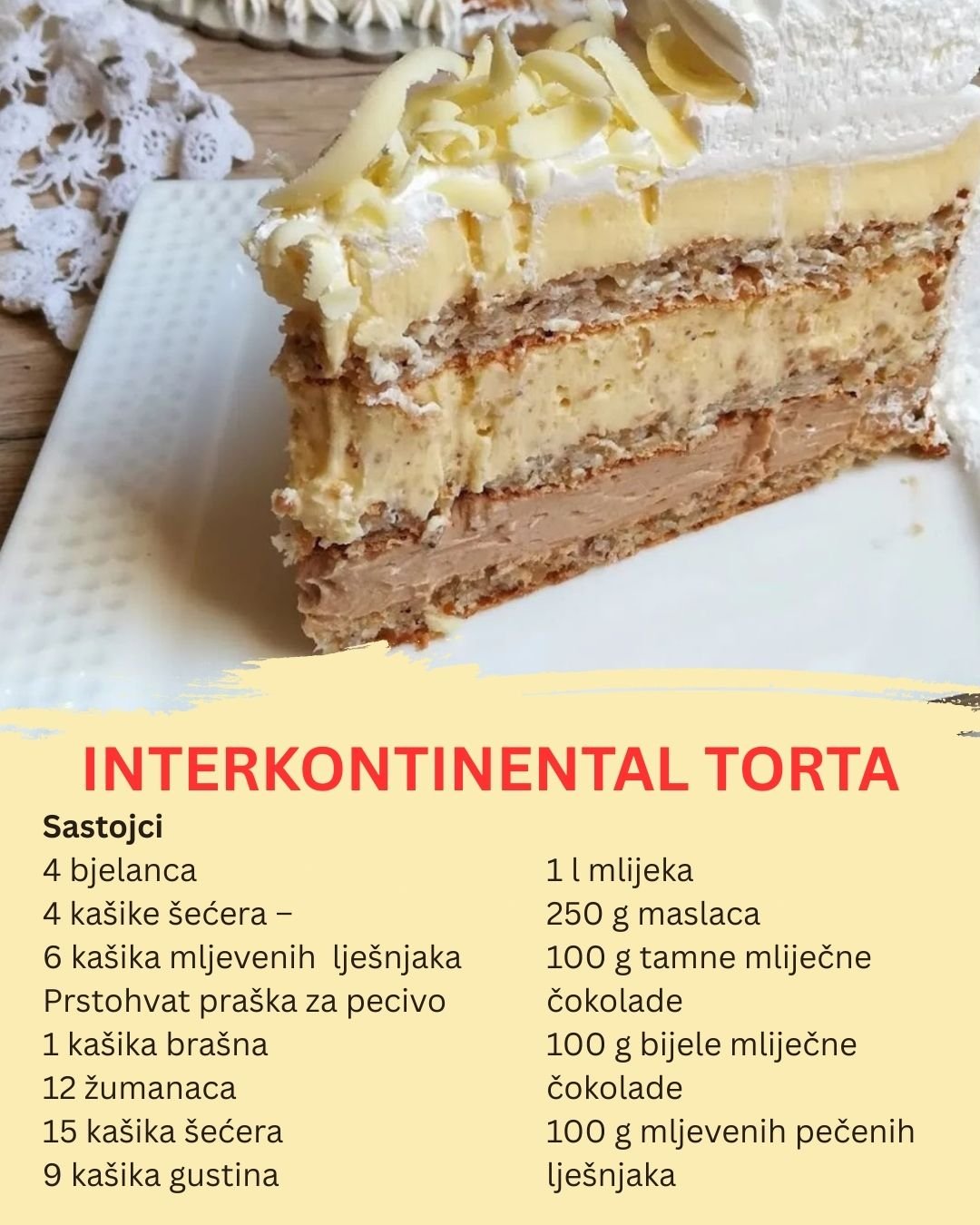 Interkontinental torta je pravi izbor za sve ljubitelje bogatih i kremastih deserata. Njena složena struktura sa hrskavim koricama i bogatim filovima od čokolade i lješnjaka pruža savršen balans tekstura i ukusa. Ovaj recept je idealan za proslave, rođendane ili bilo koju posebnu priliku. Iako priprema zahteva nekoliko koraka, rezultat je svakako vredan truda. Vaša torta će biti prava zvezda stola, a svi gosti će biti oduševljeni njenim bogatstvom i savršenim ukusom.