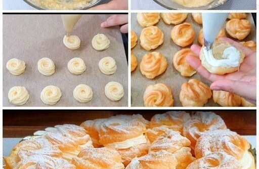 Oblikovanje i pečenje: Položite tijesto u kesu i u obliku vijenca istisnite na lim za pečenje obložen papirom. Zagrijte rernu na 250 stepeni i pecite 10 minuta (obavezno kontrolisati).
