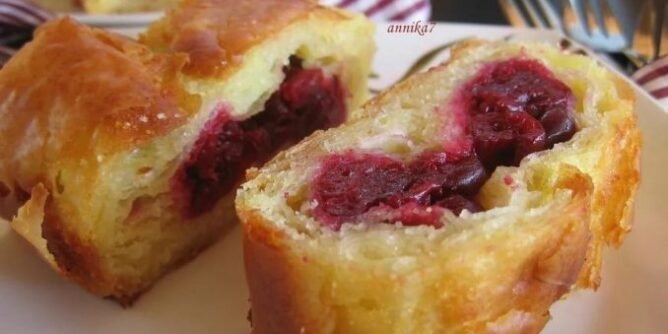 Sada po rubu lista oko 10cm stavite nadjev po želji, u mom slučaju to su višnje i polako zarolajte.
