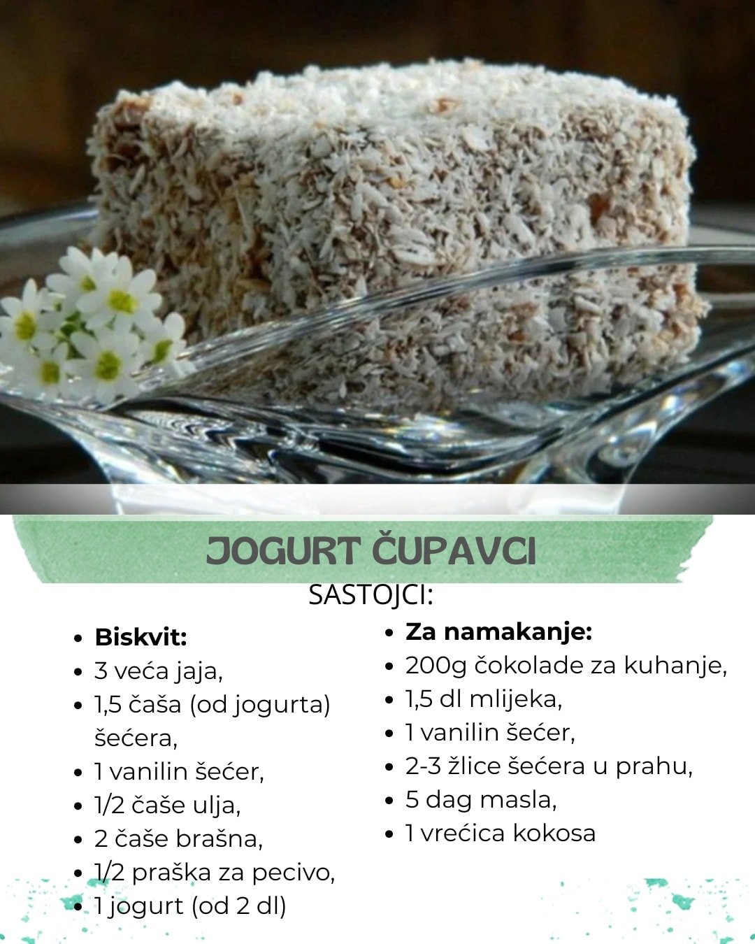 Gotovi, ohlađeni biskvit izrezati na kocke. Svaku umočiti u smjesu od čokolade, pa u kokos, ostaviti da se dobro ohladi.