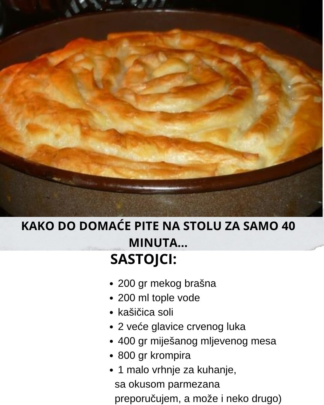 Za sat vremena od trenutka kada počnete praviti domaću pitu možete imati sirnicu ili zeljanicu, pošto je izrada fila najjednostavnija. Fil koji vam ovaj put predlažem zahtjeva više vremena, pa će vrijeme postupka biti u ovom slučaju duže.
