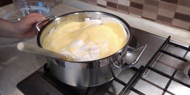 Kada mleko prokuva skloniti sa vatre,dodati zumanca sa pudingom i gustinom,mesati zicom da ne budu grudvice,vratiti na tihu vatru i mesati dok se dobro ne zgusne.
