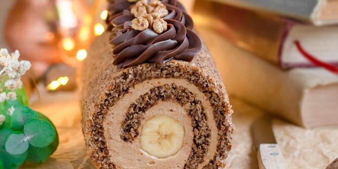Za ukrašavanje rolata pripremiti čokoladni ganache… U odgovarajućoj šerpi izlomiti čokolade, preliti slatkim vrhnjem i zagrijavati na umjerenoj temperaturi. Miješati silikonskom špatulom dok se sva čokolada ne otopi. Ostaviti u frižider na hlađenje dok se ganache ne stegne. Kremu prebaciti u vrećicu za ukrašavanje u koju smo stavili željeni zvjezdasti nastavak i formirati na rolatu „ruže“. Ukrasiti polovinama oraha, rezati na kriške i servirati.