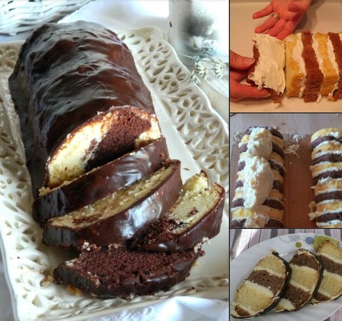 6 Sada sa kremom naizmjenice “lijepiti” tamno tjesto sa bjelim tjestom. Tako skroz dok ne potrošimo svo tijesto. Ja sam napravila ovaj put 2 komada od pola metra, jer nisam imala niti jednu dugačku tacnu na koju bi mi stao metar kolača.
