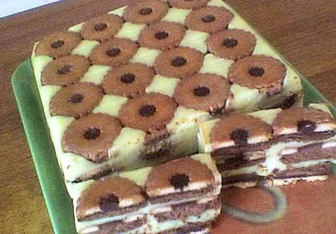 U tom rastvoru malo natopiti kekse i redati ih u kalup obložen pek-papirom. Smeđu stranu keksa okrenuti gore!