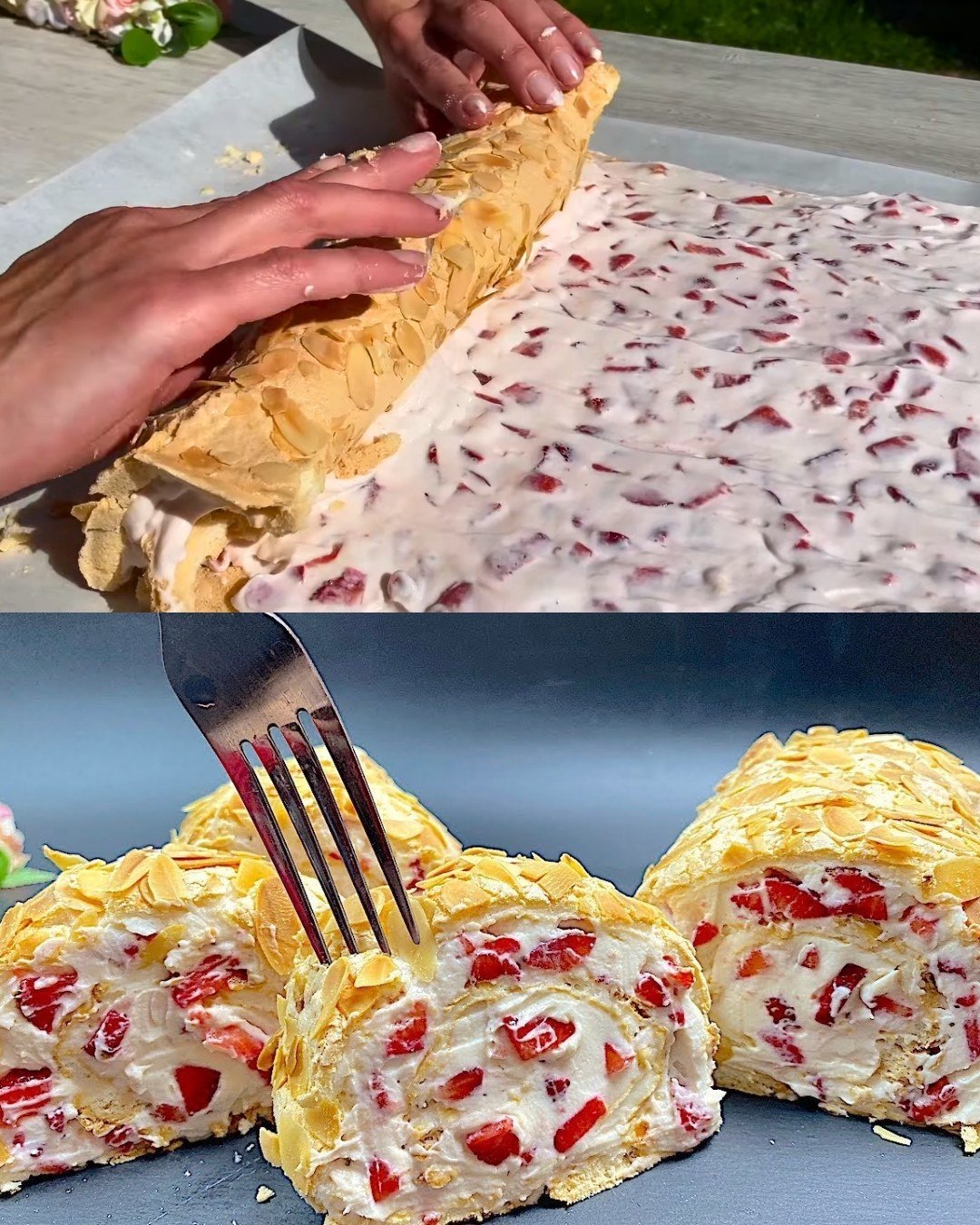 Kad je kora hladna, pažljivo je izvadi i stavi na tanjir. Premaži polovinom kreme, poređaj jagode u jednom sloju, pa premaži ostatkom kreme. Po želji ukrasi dodatnim jagodama i bademima.