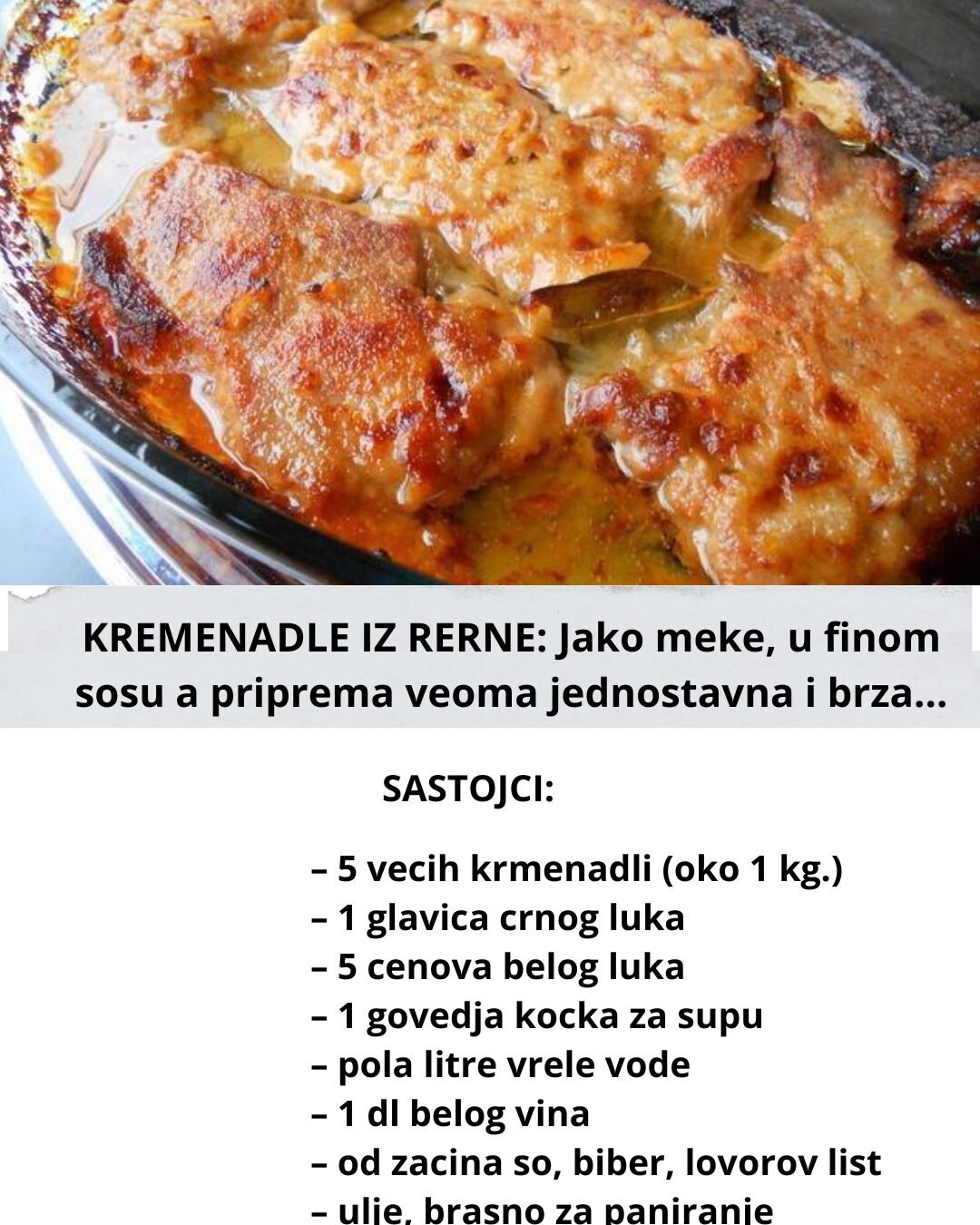 Preliti krmenadle sosom iz tiganja, da ih potpuno prekrije sos jer ce one tecnost upiti.Poprskati ih vinom. Poklopiti vatrostalnu posudu ili je prekriti alu-folijom i peci u rerni 45 minuta na 180 stepeni, zatim otklopiti i peci jos deset minuta otkriveno.