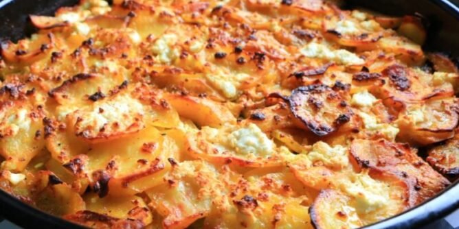 Iseckajte luk na sitno i krompir na kolutove. Stavite u tepsiju, dodajte začine i promešajte. Odozgo izmrvite sir, pouljite i dodajte vodu.