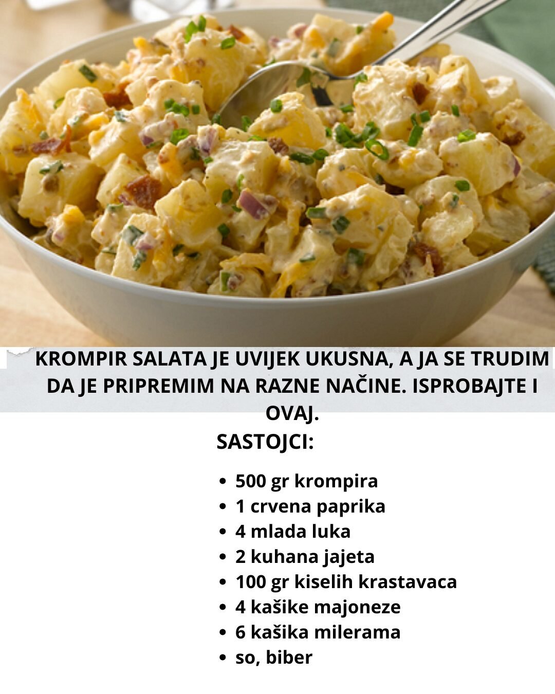 Krompir skuhajte u vodi zajedno sa ljuskom. Ogulite ga i izrežite na kriške. Pomiješajte sa sjeckanim jajima, paprikom i mladim lukom. Dodajte sjeckani kiseli krastavac i dobro promiješajte. Mileram promiješajte sa majonezom pa dodajte u salatu. Dobro promiješajte i ostavite u frižideru da se ohladi.