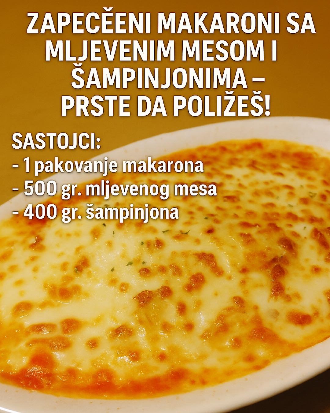 Zapečeni makaroni sa mljevenim mesom i šampinjonima.