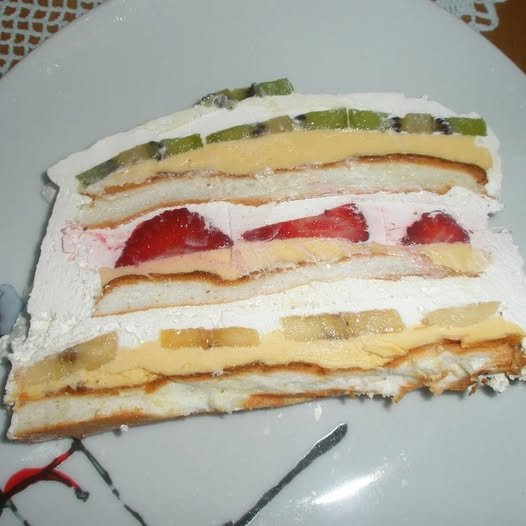 Ponavljajte ovaj postupak sa preostalim korama i voćem po izboru. Svaki sloj treba biti lepo izbalansiran, sa kremom i voćem koji se međusobno nadopunjuju. Na poslednjem sloju, kada završite sa voćem, kolač premazujete preostalim slatkim vrhnjem i ukrasite po želji.
