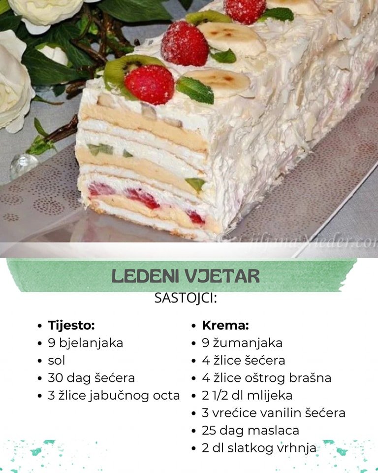 Sastojci za koru: 7 belanaca 1 celo jaje 7 kašika šećera 7 kašika brašna 3…