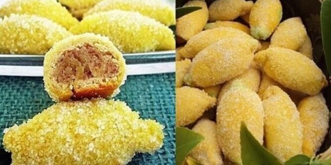 Poredajte na lim obložen pek papirom i pecite ih na 160 otprilike 20 minuta. Ohlađene limune namočite u mlijeko u koje ste dodali boju i maraskino. Zatim ih uvaljajte u šećer.