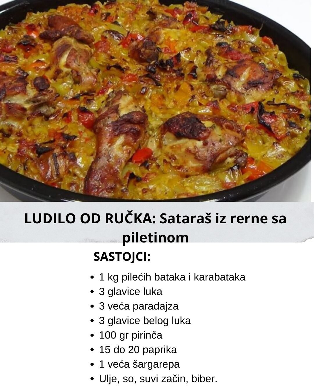 Priprema: Piletinu zasecite pored koske da bi se lakše ispržila pa je dobro začinite. Pržite je malo na ulju. Zatim je izvadite na tanjir, a u ulje u kojem se peklo meso sada stavite crni luk sitno seckan. Kad luk požuti dodajte mu sitno seckane paprike. Kada luk i paprike omekšalju, dodajte oljušten paradajz, a potom i rendanu šargarepu i začine. Dodajte pirinač i promešajte. Nakon par minuta dodajte i piletinu i nalijte vode da sve ogrezne. Peći u zagrejanoj rerni na 200 stepeni Celzijusa oko 25 minuta.