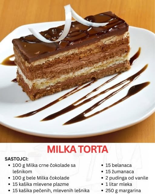 Milka torta se slaže slojevito, smenjujući kore i filove kako bi se postigao balans ukusa i vizuelni efekat: Redosled slaganja slojeva: