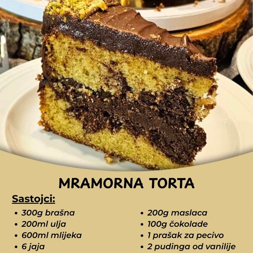 Umuti jaja sa šećerom i vanilin šećerom dok ne postanu pjenasta. Dodaj ulje, mlijeko i na kraju brašno pomiješano s praškom za pecivo. Podijeli smjesu na dva dijela – u jedan dodaj kakao, a drugi ostavi žut. U pleh sipaj naizmjenično žutu i tamnu smjesu da dobiješ mramorni izgled. Peći na 180°C oko 30–35 minuta, dok čačkalica ne izađe suha. Ohladi.