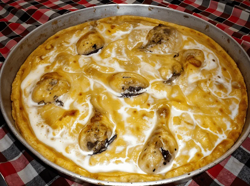 Na toplo ulje izlijte trećinu pripremljene smjese od jaja i brašna. Na to rasporedite popečeno meso, a po mesu izlijte preostalu smjesu od jaja, brašna i mlijeka. Pecite u pećnici zagrijanoj na 210°C, 20-30 minuta. pečenu kvrgušu malo ohladite, narežite, poslužite uz salatu.