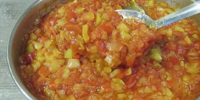 Zatim žutim opranim paprikama ukloniti semenke, pa ih iseckati na trakice. Na isti način pripremiti i zelene paprike. Zatim izvaditi paradajze iz vode te im ukloniti kožicu i naseći na kockice. U veću posudu sipati ulje za prženje i pustiti ga da se zagreje.