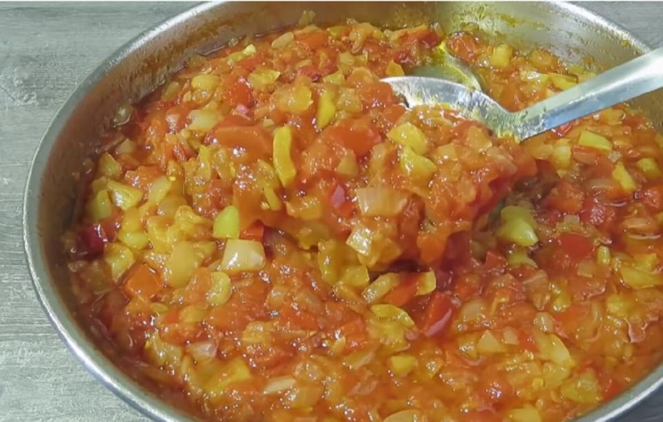 Zatim žutim opranim paprikama ukloniti semenke, pa ih iseckati na trakice. Na isti način pripremiti i zelene paprike. Zatim izvaditi paradajze iz vode te im ukloniti kožicu i naseći na kockice. U veću posudu sipati ulje za prženje i pustiti ga da se zagreje.