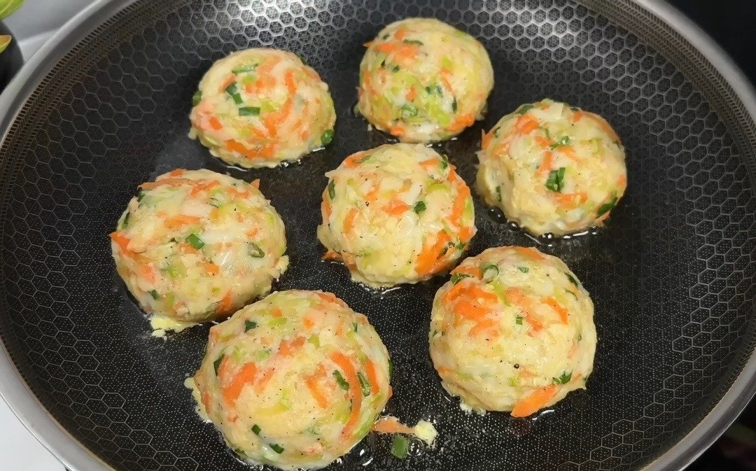 Nakon 15 minuta uklonite višak vlage iz tikvica i stavite ih u veliku zdjelu za miješanje. Pomiješajte naribani krumpir, mrkvu, suluguni sir, mladi luk, jaja, sol, crni papar, mljeveni češnjak i griz. Temeljito izmiješajte sve sastojke.