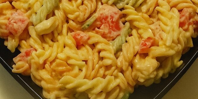U međuvremenu, dok se meso prži, potrebno je skuhati šarenu tjesteninu u slanoj vodi. Preporučuje se korištenje tjestenine sa spiralama ili mašnicama jer zadržavaju sos bolje i lijepo izgledaju u salati. Tjesteninu kuhajte al dente – dakle, da ostane lagano tvrda pod zubima. Kada je tjestenina gotova, procijedite je i ostavite kratko da se prohladi.