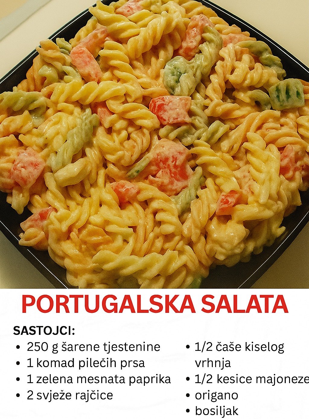 U međuvremenu, dok se meso prži, potrebno je skuhati šarenu tjesteninu u slanoj vodi. Preporučuje se korištenje tjestenine sa spiralama ili mašnicama jer zadržavaju sos bolje i lijepo izgledaju u salati. Tjesteninu kuhajte al dente – dakle, da ostane lagano tvrda pod zubima. Kada je tjestenina gotova, procijedite je i ostavite kratko da se prohladi.