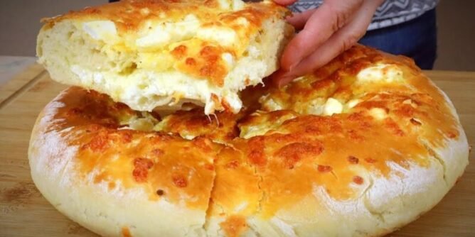 Pomešajte izrendan čedar i izmrvljenu fetu, pa sjedinite. Odvojite nekih 50 g sa strane, a od ostatka napravite loptu. Na dobro pobrašnjenu površinu stavite testo, pospite sa još malo brašna i premesite. Razvucite testo rukama i na sredinu stavite loptu od sira.