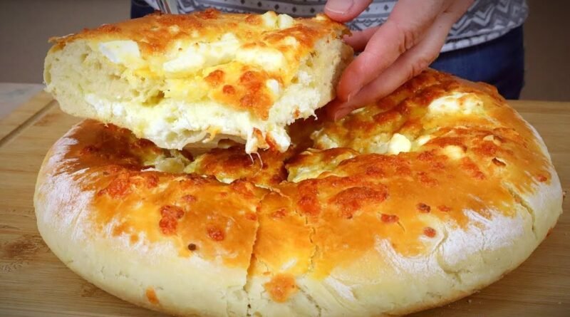 Pomešajte izrendan čedar i izmrvljenu fetu, pa sjedinite. Odvojite nekih 50 g sa strane, a od ostatka napravite loptu. Na dobro pobrašnjenu površinu stavite testo, pospite sa još malo brašna i premesite. Razvucite testo rukama i na sredinu stavite loptu od sira.